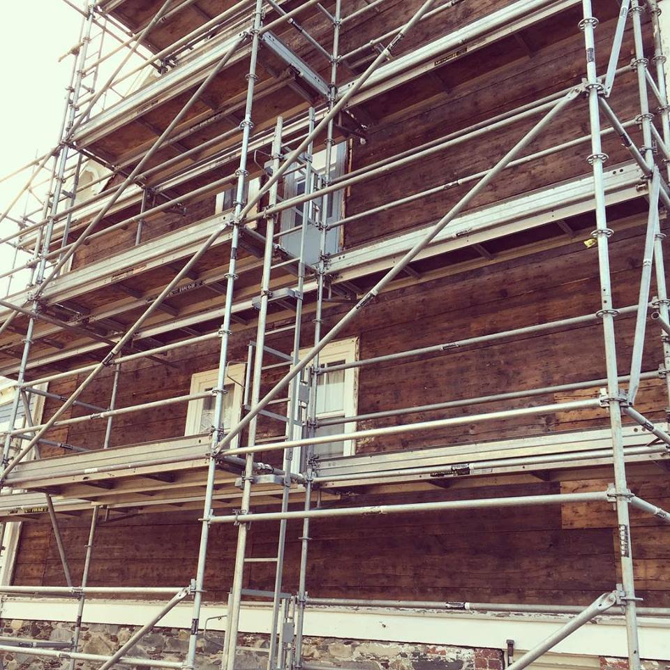 The north side of the house is being re-shingled and the planks that you see in the first photo are the original planks from the 1860s! The floating door that was on the side of the house has been removed and replaced with a window. The door was installed when Helen Creighton resided at Evergreen and had divided the house into apartments. The roof is being re-shingled too.
